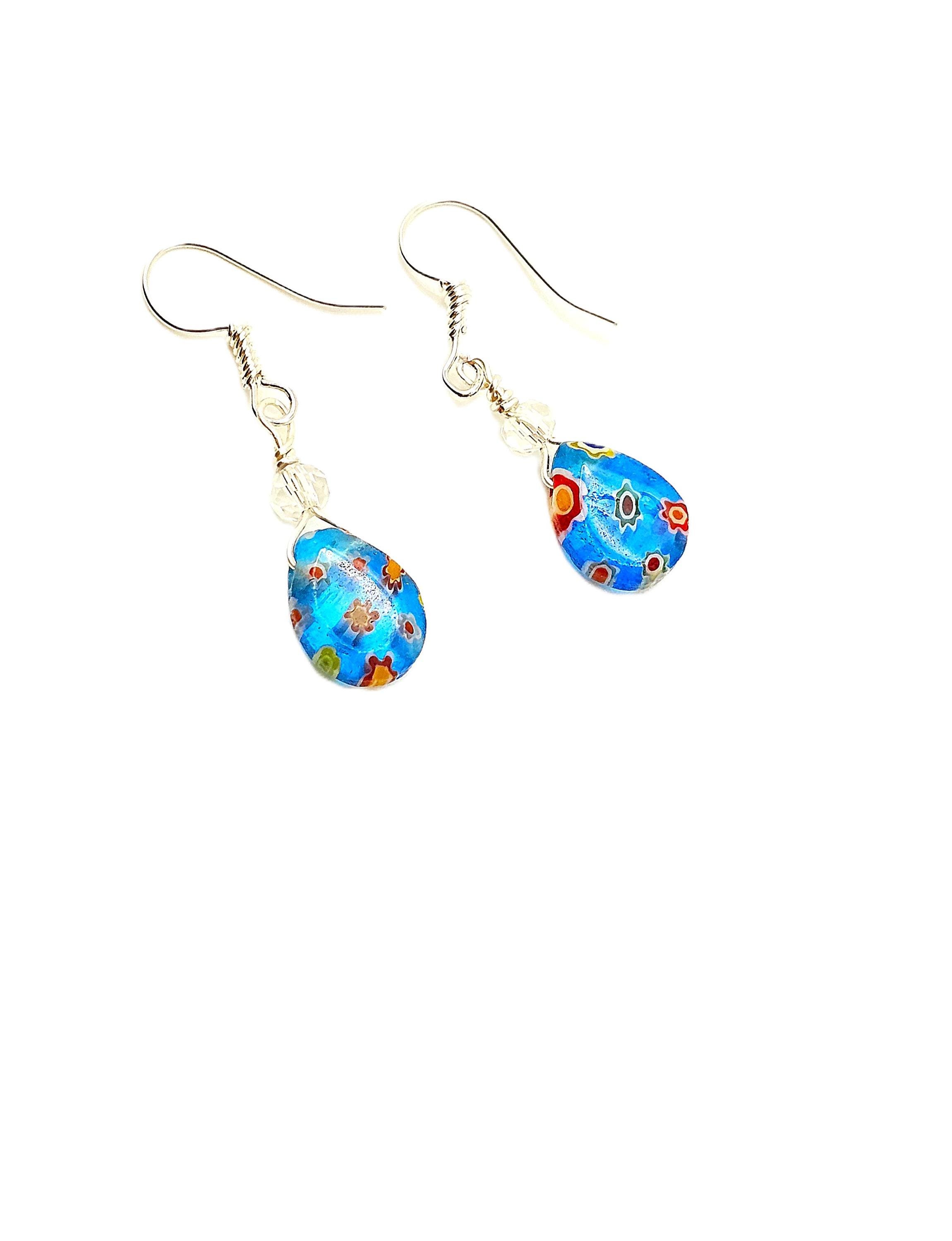 Bring elegance to your style with these aqua blue millefiori resin earrings adorned with intricate floral details in yellow, white and red with crystal beads. Perfect for adding a pop of color to your look. Very boho chic.